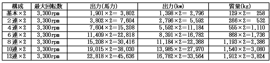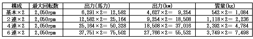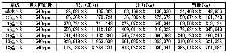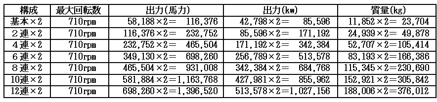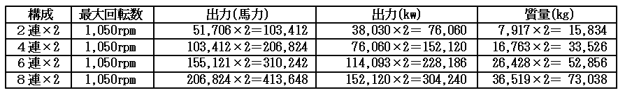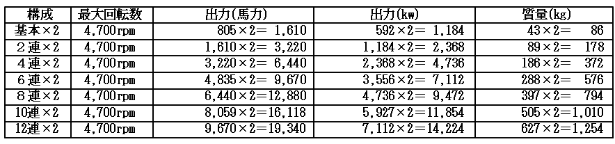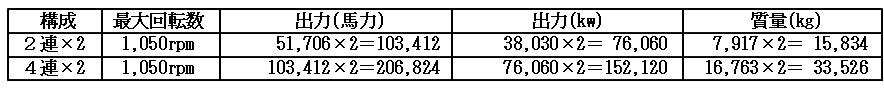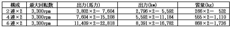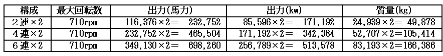 ボア90の6連×2×4基=22,818馬力×4=91,272馬力、本体重量=1,736kg×4=6,944kg(58%削減)
