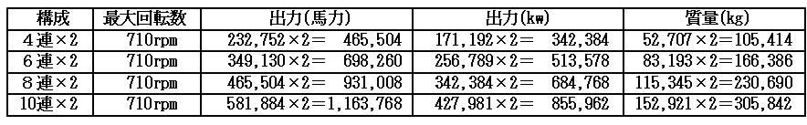◇ボア480ディーゼルエンジンで対向完全釣合型:出力=34万2,384kw〜85万5,962kw