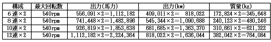 ◇ボア160ディーゼルエンジンで対向完全釣合型:出力=1万2,582馬力〜15万1,004馬力、